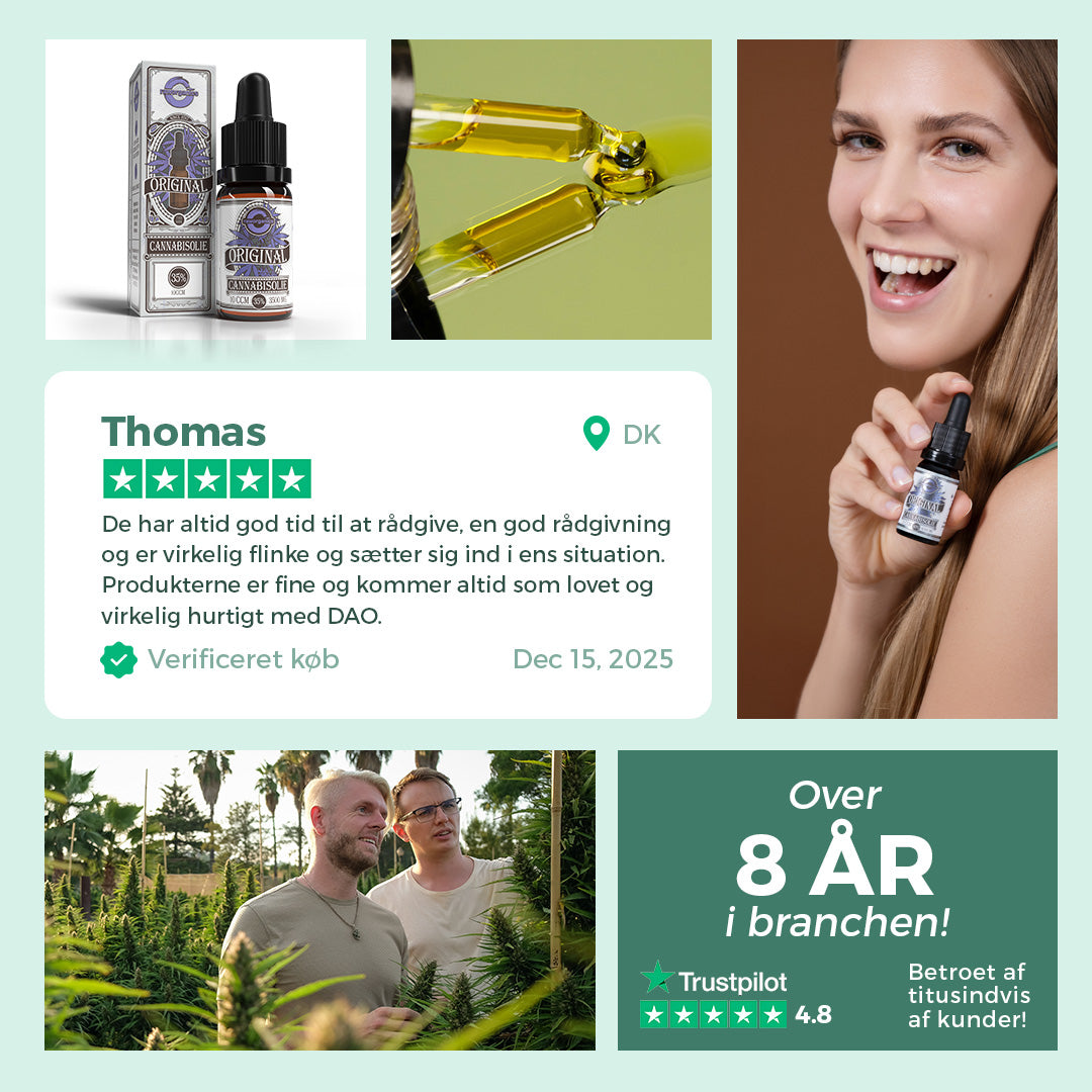 Orginal fås i koncentrationer fra 5% til 35% og er fremstillet af økologisk hamp. Vi samarbejder med nøje udvalgte farmere for at sikre, at vi altid får biomasse af højeste kvalitet af somme sort. Vores olier er fuldspektrum, hvilket betyder, at de indeholder en bred vifte af cannabinoider og terpener, ligesom den oprindelige plante. Derudover indeholder olien også omega-fedtsyrer og vitaminer.