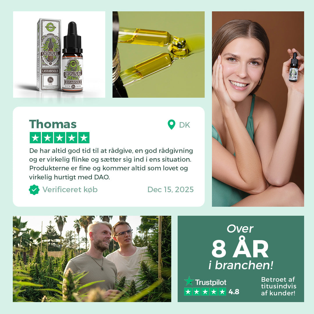 Er du klar til at løfte din velvære til nye højder? Vores 5% Original CBD-olie indfanger essensen af naturens bedste, omhyggeligt blandet med økologisk hampefrøolie. Hver dråbe indeholder det fulde spektrum af cannabinoider og terpener, der arbejder i harmoni for at give dig en autentisk og berigende oplevelse. Olien er testet og verificeret af Fundación Canna, et anerkendt analyseinstitut i Madrid. Bestil og gør noget godt for dig selv i dag!